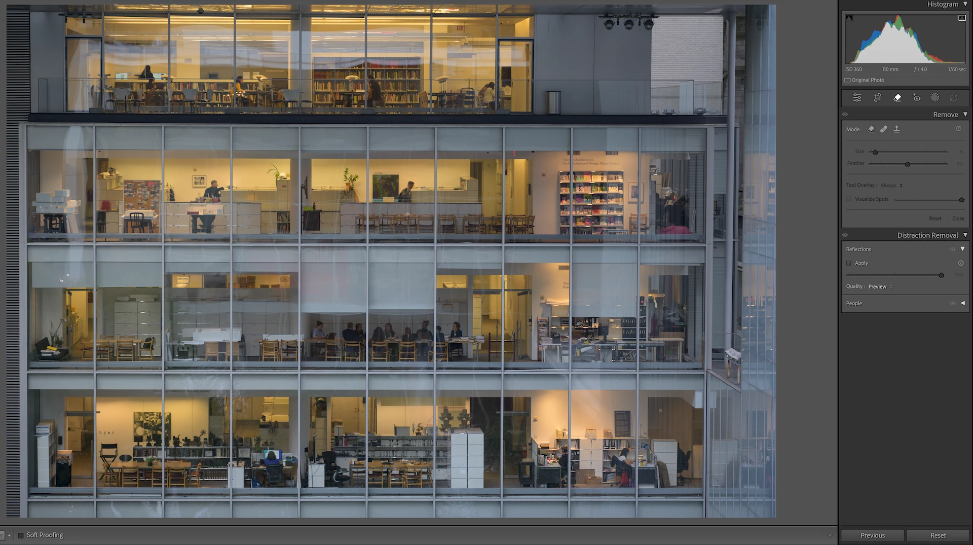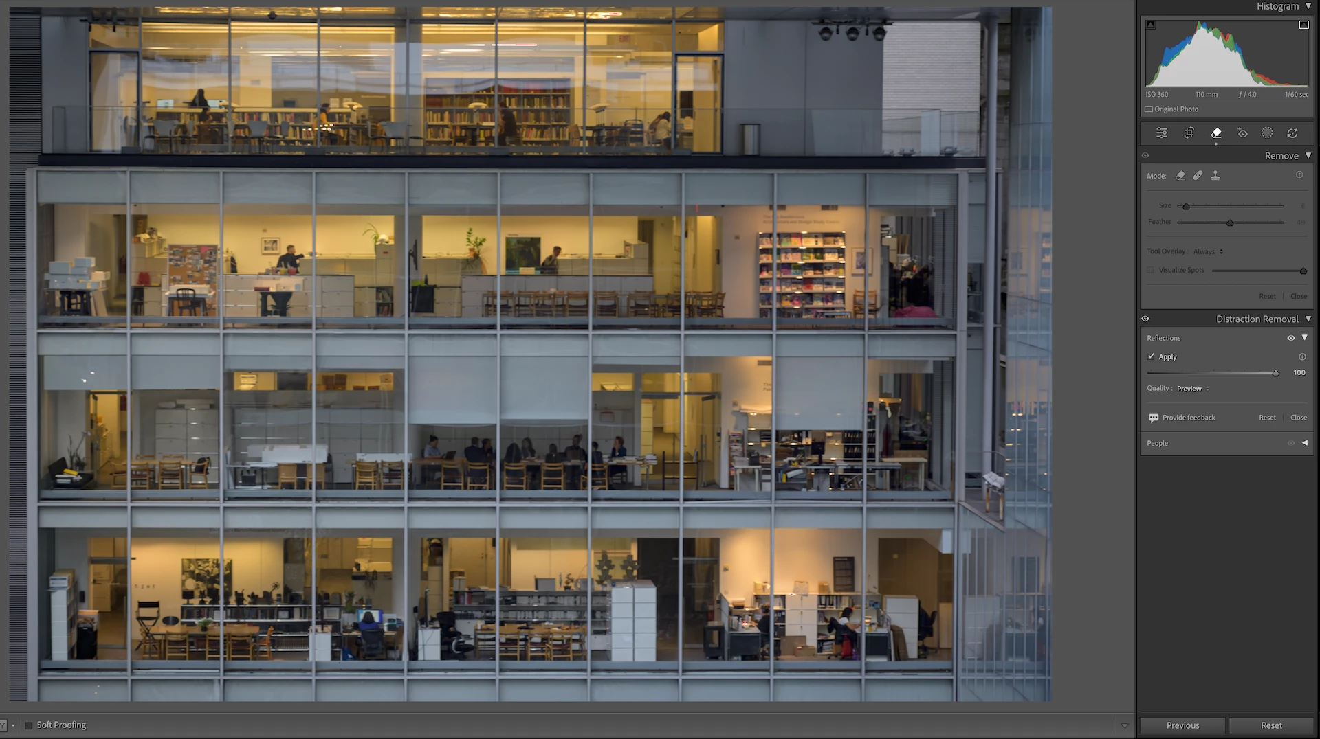 This is a terrific result. Thanks for sharing. As you probably know, the remove reflections tool is designed to remove reflections from glass that is in-between the camera and the subject of the photo (see the Adobe blog). Photos like this one are difficult because the subject is ambiguous: are you photographing the building, or the content within the building? While the answer might seem obvious to you as you look at this photo, there are a great many other photos in which a building has reflections on it and the user does not want to remove those reflections: imagine almost any photo you take of a building as you are standing on a city street outdoors. To resolve that ambiguity, this tool assumes that everything in your camera view is your subject, and it only removes reflections if there is a pane of glass blocking your entire subject. That is not the case for photos of buildings, like the one above, so the reflection removal result is more conservative (slightly incomplete). We will continue to work to improve the tool so you can use it as you need. Stay tuned for updates!