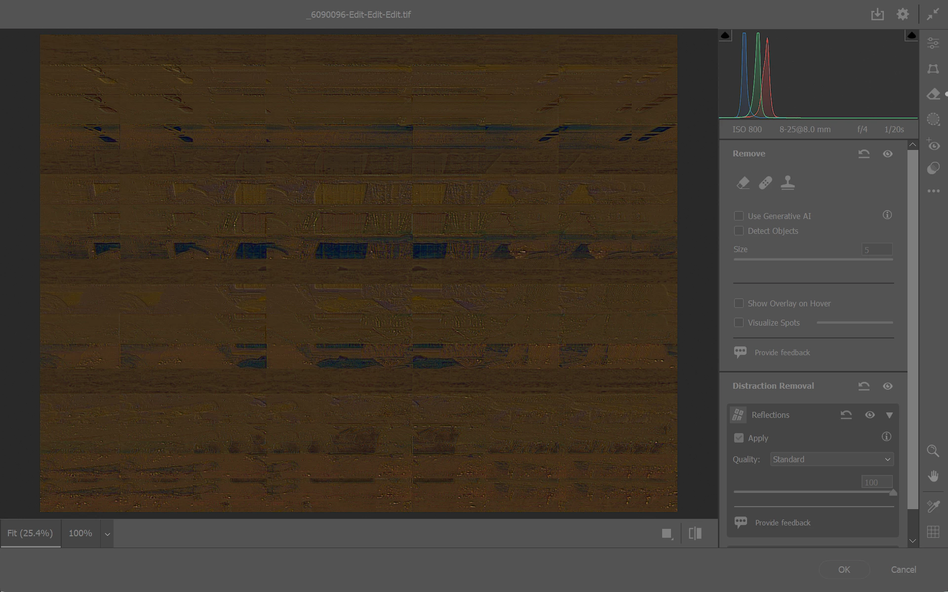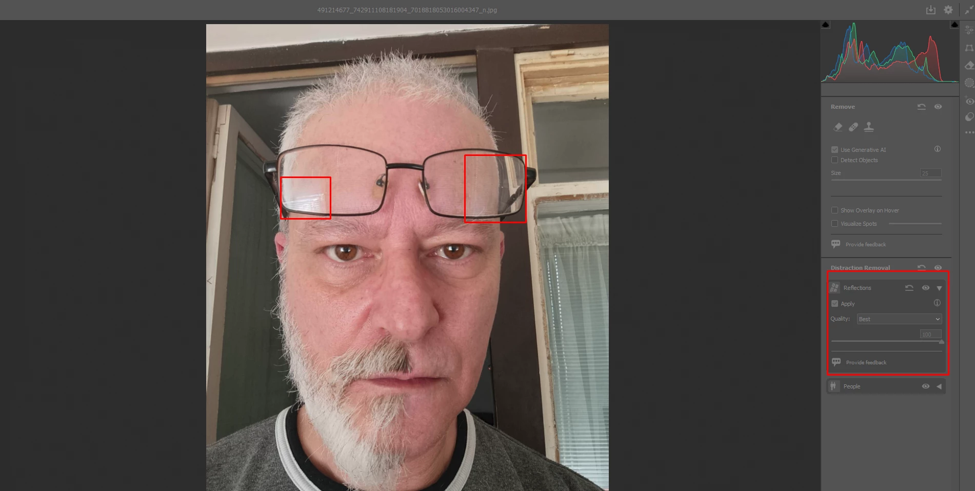 • Apply Reflection Removal before applying any other edits to the photo, except for Enhance features such as Denoise
