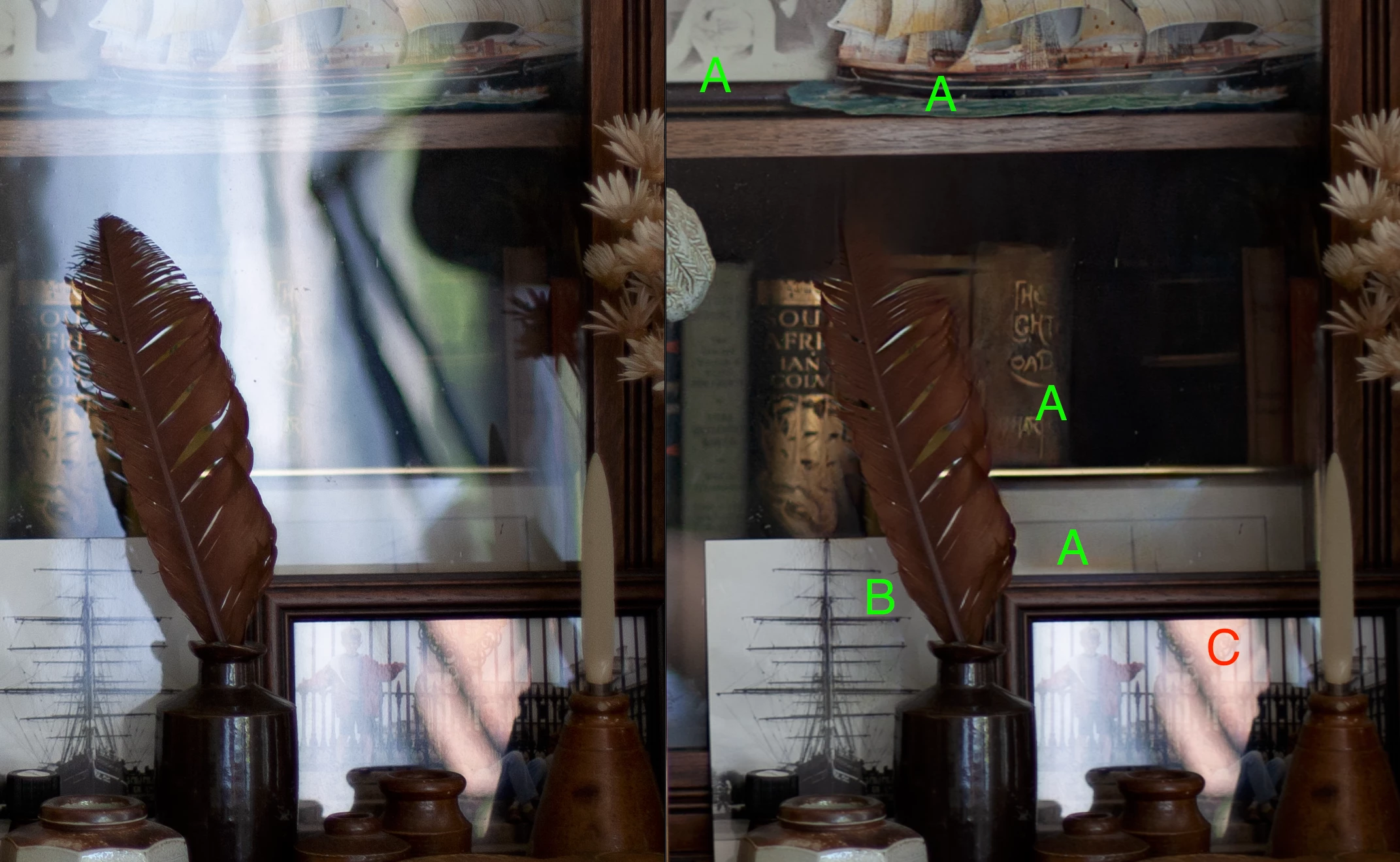 BRAVO!  Reflection Removal is amazing! It just saved at least 30 minutes of fiddling with a distracting reflection on a photo of a glass cabinet. It did a great job of recognising and restoring photographs, ship, and book (see  (A) on screen shot (1)); implemented the intelligent removal of a shadow that was only visible in the first place due to the reflection that was removed (B). The ability to see what was being reflected is also quite extraordinary.