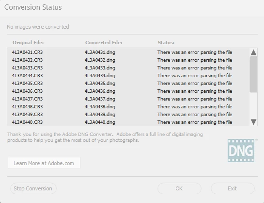 Just purchased a Canon R6 Mark ii and shot some pictures in RAW and JPEG of my son's basketball game. Got home, offloaded the pics onto my hard drive and tried to convert to DNG like I did with my old camera RAW files. Every file shows the error message "There was an error parsing the file."