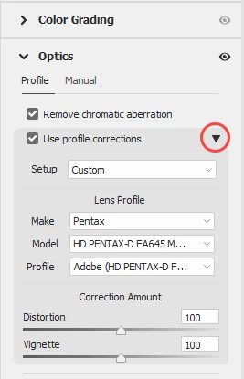 Where can I find the lens profile dialogue box in Photoshop CC raw processor. I want to asign my lens profile to a batch of images waiting to be processed.