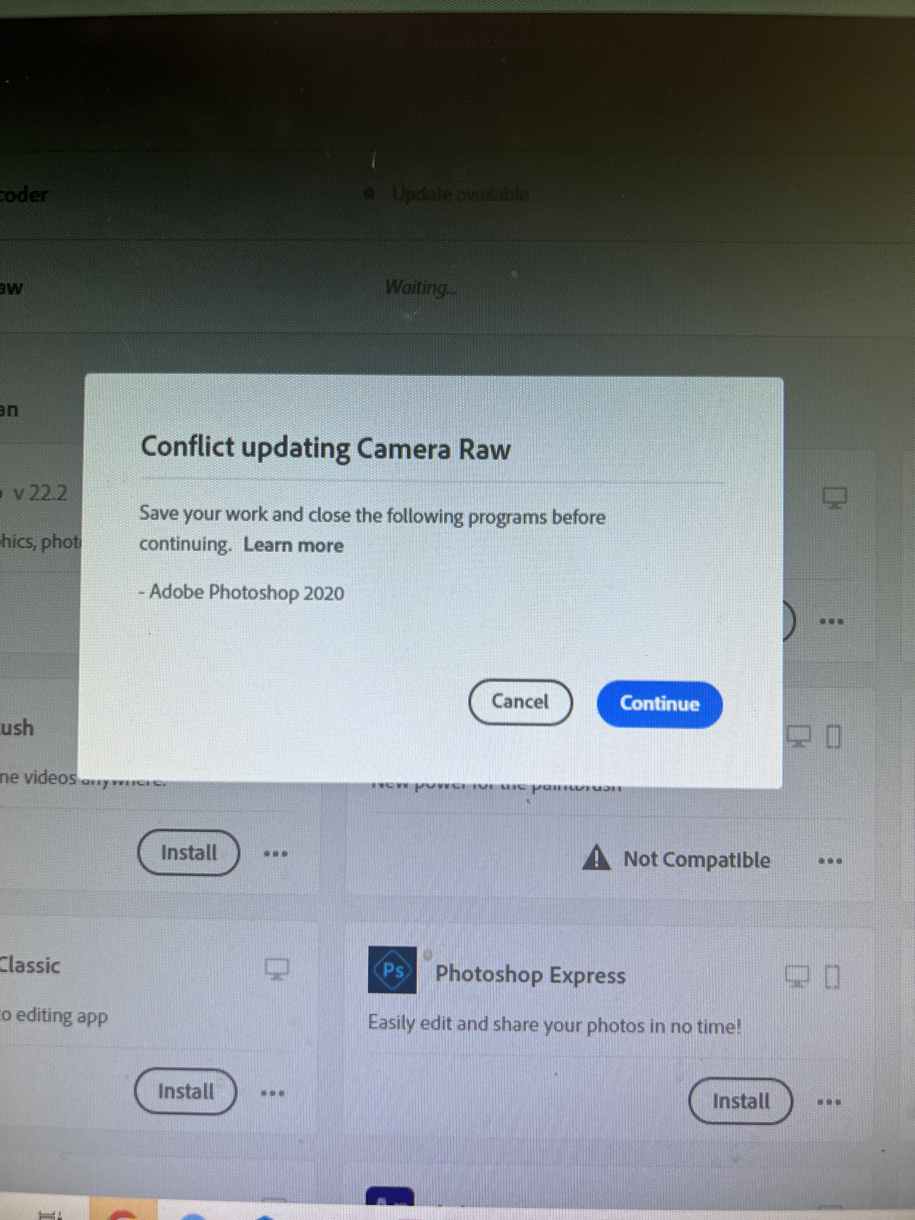 What used to take seconds to save photos in camera raw is taking hours today... I noticed I needed to make an update in camera raw, so I've been trying to and keep getting an error telling me to close Photoshop. It is closed. And yet, I still keep on getting this error! I've tried all sorts of things..: restarting my computer, checking in task manager etc. I don't know what is all of the sudden making it slow, but this is a big problem for me!