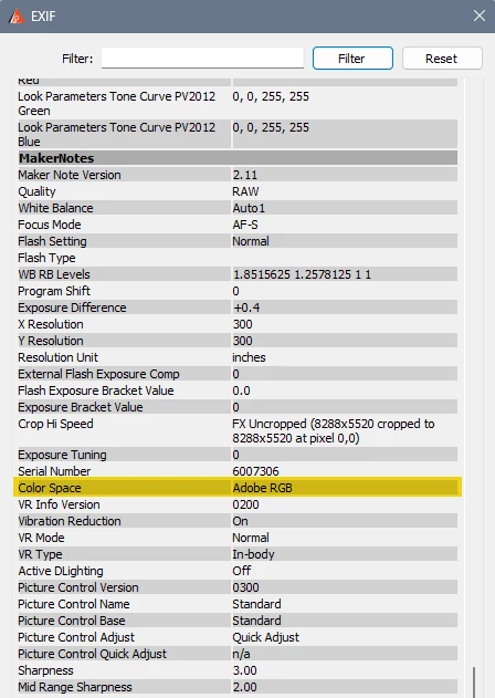 opening the original NEF file with MacOS’s preview and then launching the Inspector tool (cmd+I) I have a “Picture Style” tab that contains informations about the colour space used in the camera settings.