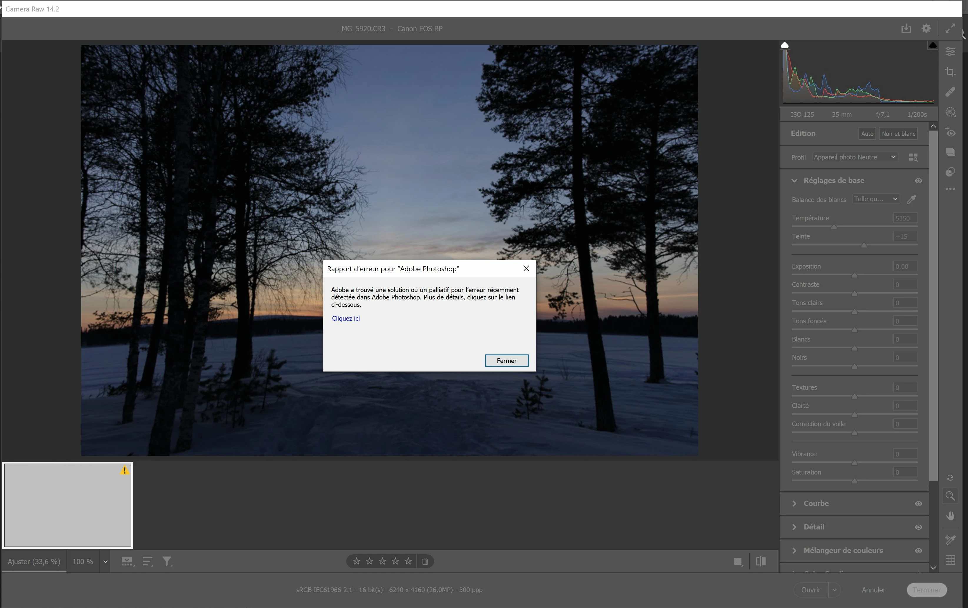 Je shoote en RAW au format .CR3 sur un EOS RP, boitier et objectifs sont bien compatibles selon la liste fournie par Adobe. Je ne parviens pas à ouvrir des fichiers dans Camera Raw : un point d'exclamation dans un triangle jaune apparait sur la miniature, et au bout de quelques secondes cela ferme le logiciel automatiquement.