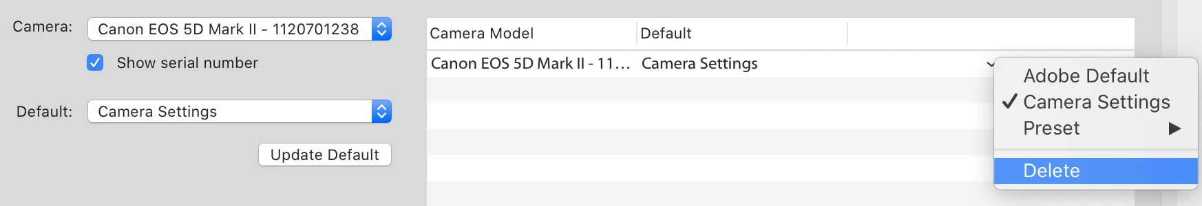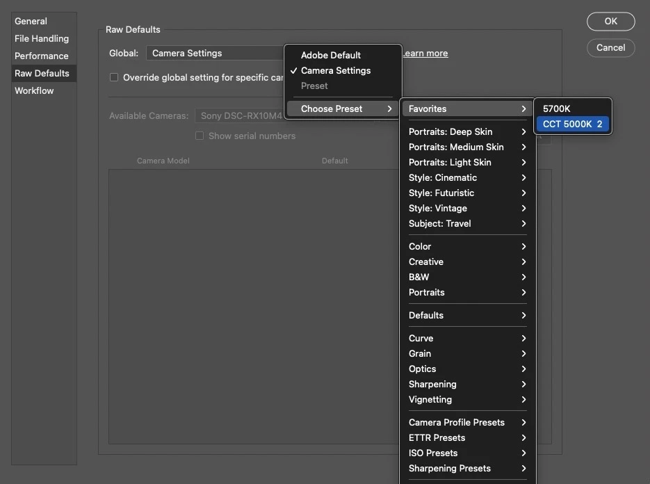does anyone know how to set a camera-profile as standard for importing raw-files.