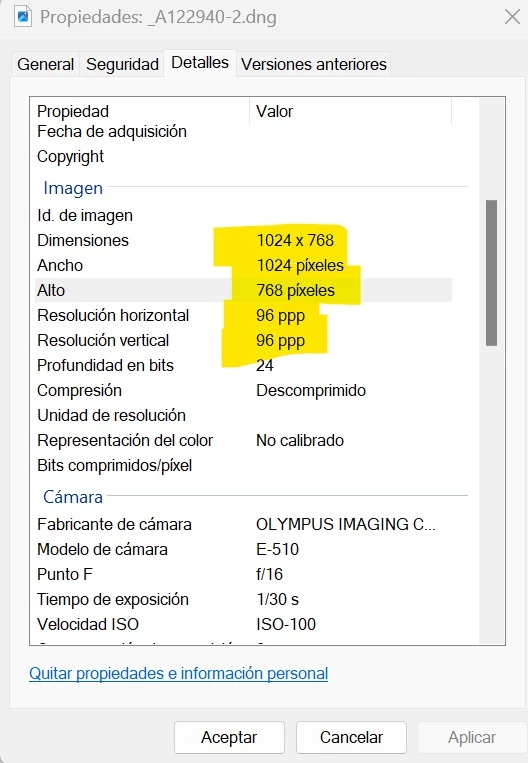 Me he dado cuenta que qualquier archivo raw convertido a DNG y con el botón derecho del ratón y en las propiedades de windows me sale un tamaño y resolución diferentes que si abro el archivo en photoshop.