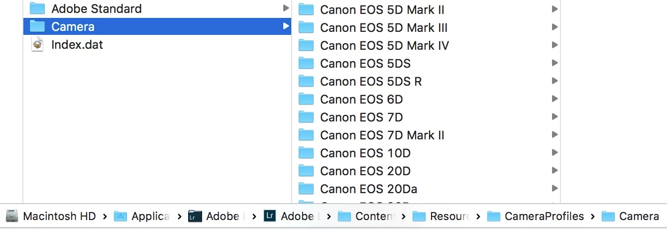 I'm familiar with the usual location of the Camera Raw profiles at Library>Application Support>Adobe>CameraRaw>CameraProfiles>Camera