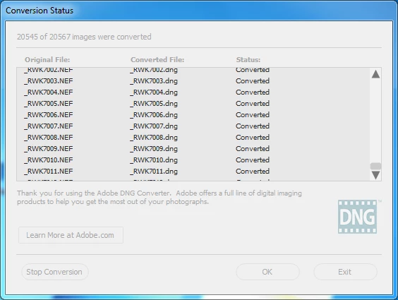 I am an archivist, working on a large collection of born-digital photos, and have been using the Adobe DNG converter version 9.8 to convert thousands of NEF files to DNG, keeping the default preferences in the converter (Camera Raw 7.1 and later compatibility, etc.). A few days ago, I converted 20567 images in one batch. When it was complete, it said that 20545 images were converted (as shown in this screenshot):
