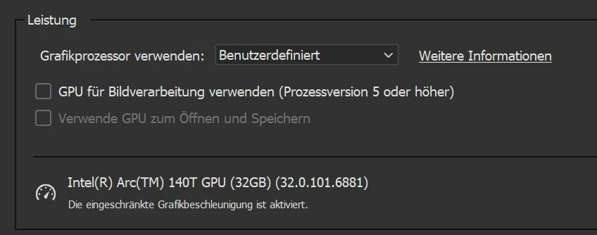 Problem: ACR 17.x bringt die Intel Arc 140T/155T-iGPU in Core-Ultra-Notebooks zum Absturz, sobald „Automatische“ GPU-Beschleunigung zum Beispiel beim AI Entrauschen läuft.