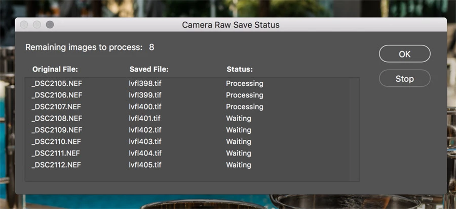 Screenshot of saving images from Camera Raw on quad-core Macbook Pro, exporting 3 images simultaneously: