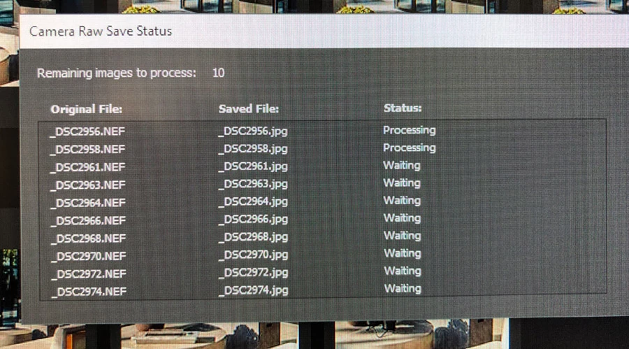 For quite a while Adobe Camera Raw has exported multiple images simultaneously when using the "Save images" dialog. On my old dual-core laptop, it would export two at once. On both of the quad-core systems I used later, it would export three images at once (I assume to leave one core available for the rest of the system). I recently built a new 6-core system (with a Core i5 8600k), but now Camera Raw is back only exporting two photos at once, with lots of extra cores just sitting idle.