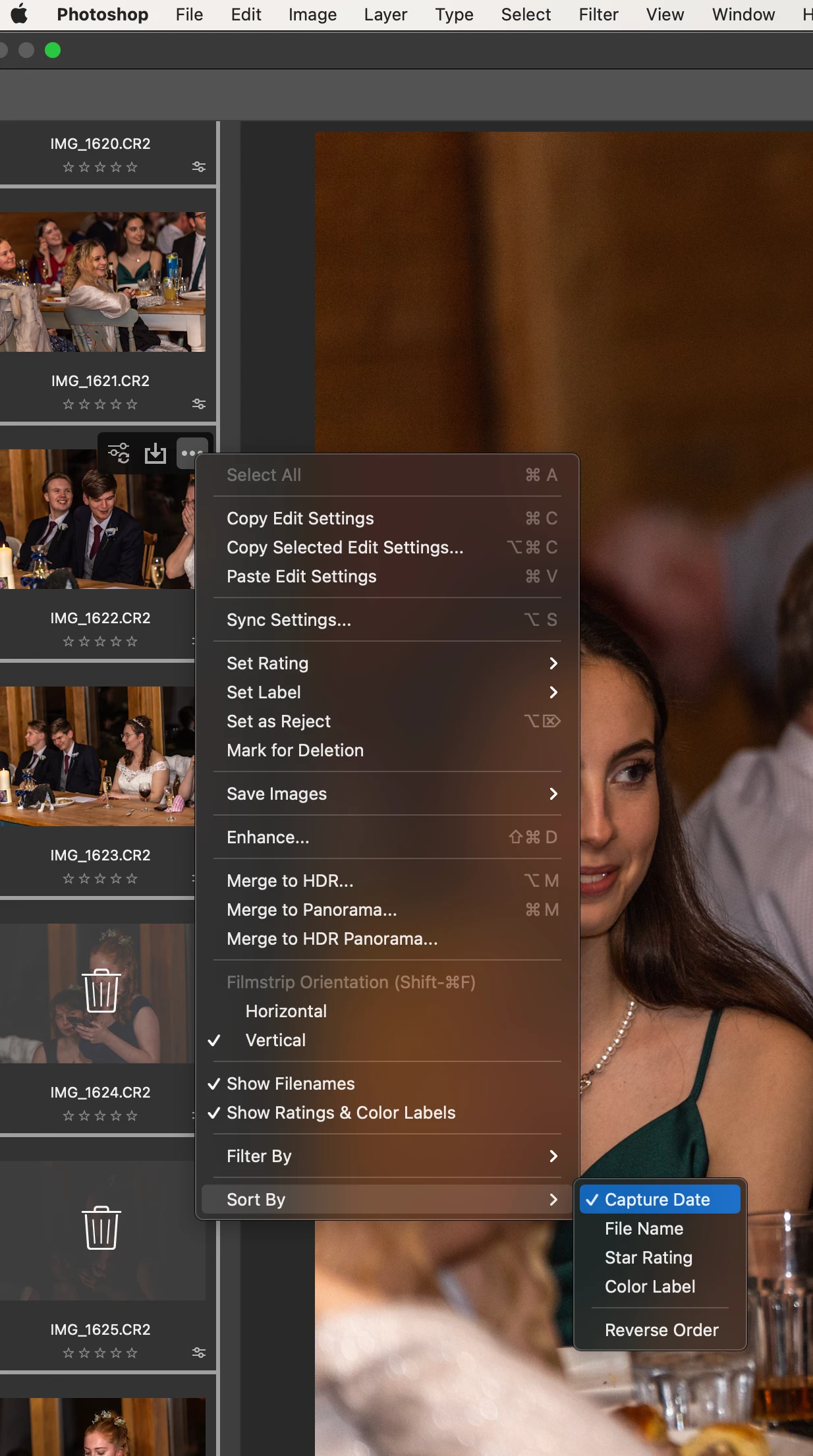 Does anyone know if there is a way to sort images into their capture time order in Adobe Camera Raw? I am a wedding photographer and use two cameras with different lenses on wedding day. I'd like to deliver my final images to the client in their chronological order. AND by that I mean time/second within the day. Currently images order themselves by file name. There are a few different ordering alternatives; By Type, By Date Created, By Date Modified, By Size etc, etc.