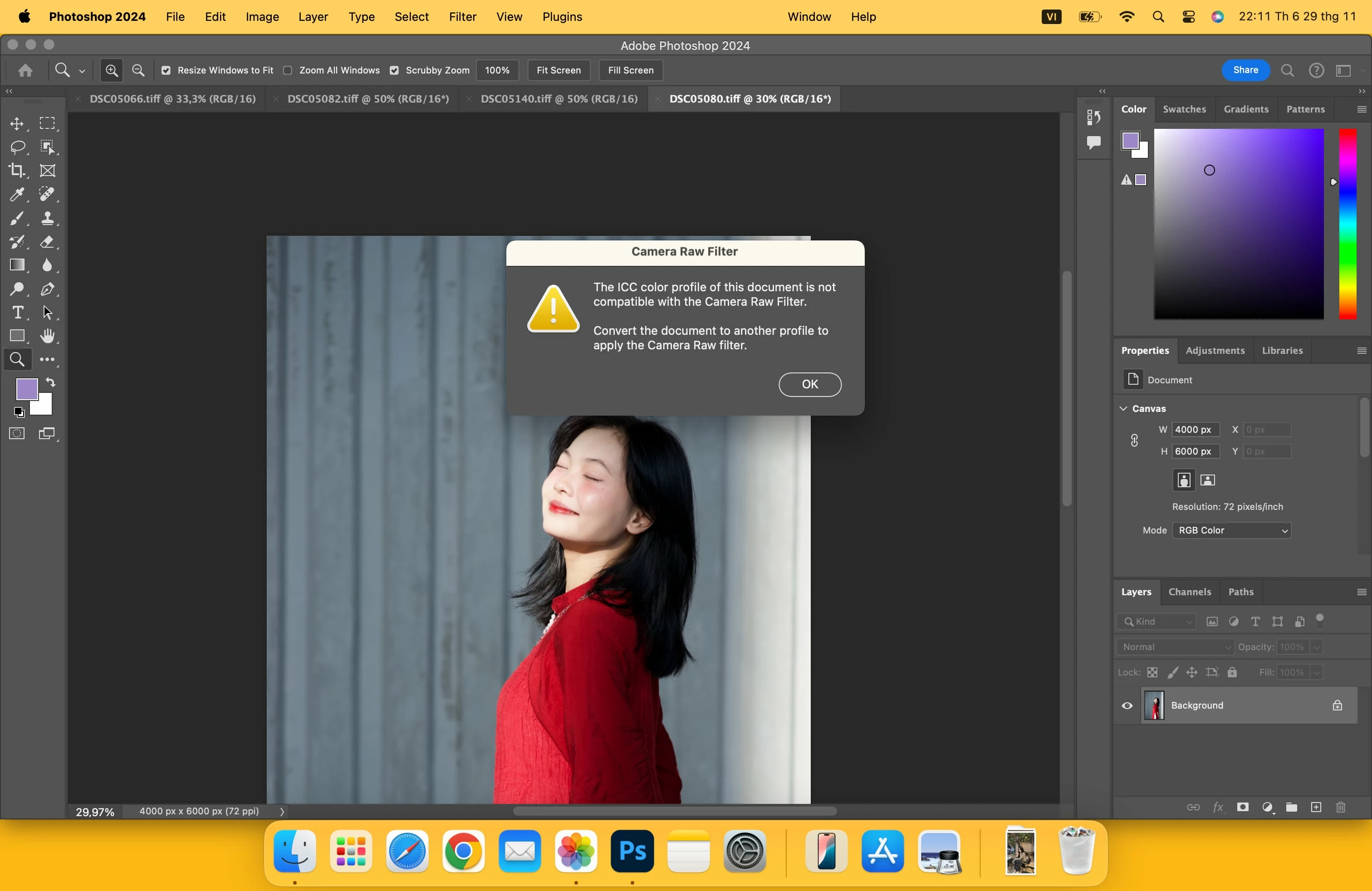 The icc color profile of this document is not compatible with the camera raw filter on macbook