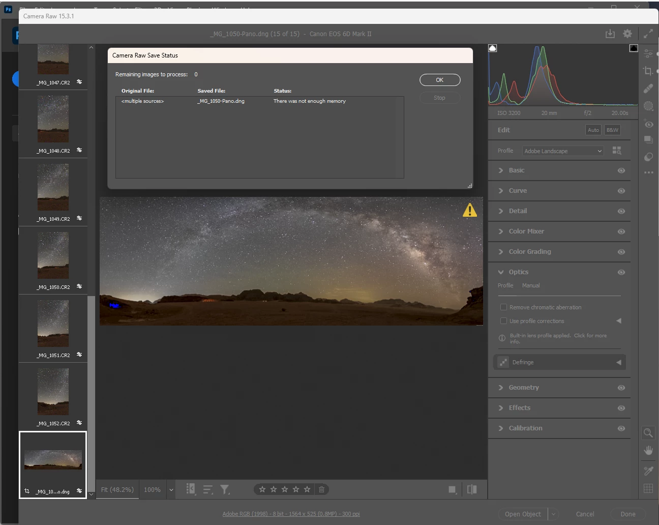 Hi, as shown in the figure below Iam trying to merge 14 Raw pictures in to a panorama, but it gives me the error (there was not enough memory) when trying to save the merged panorama.