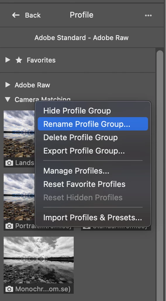 After trying to figure out how to rename a camera matching profile in Lightroom, I attempted to do so in Camera Raw instead.