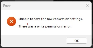 Unable to  save he raw conversion settings,