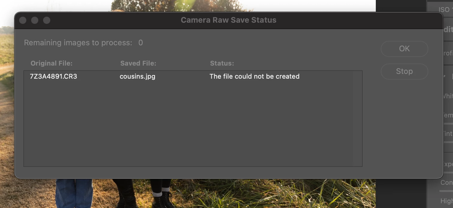When editing in ACR and go to hit save I get the message under status "this image could not save"