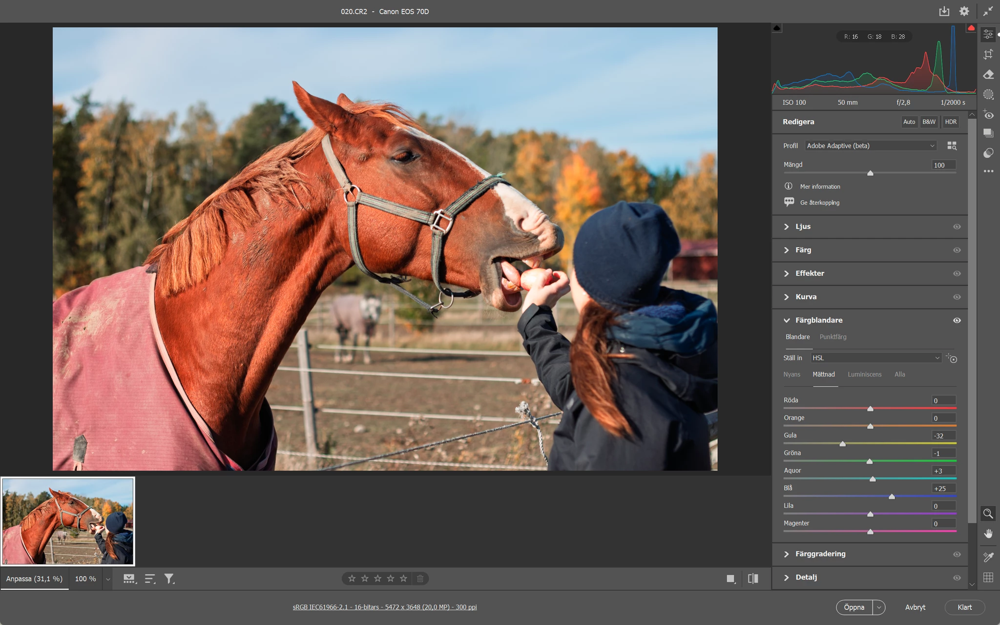 Editing colours in (right now) impossible, since the colouring looks one way in Camera Raw-mode (see image "photoshop raw-sRGB"), and another way when opened in regular photoshop, and then saved in jpeg-format (see the other two images).