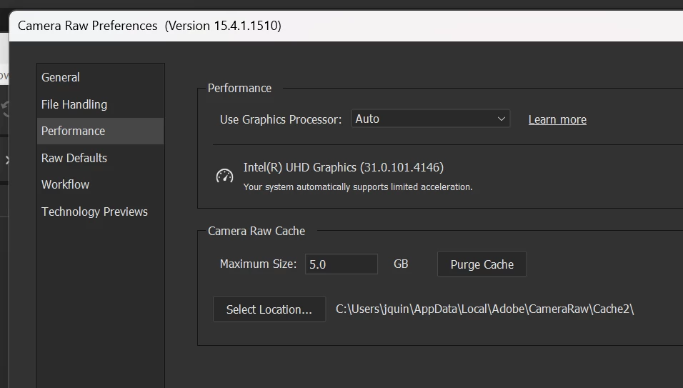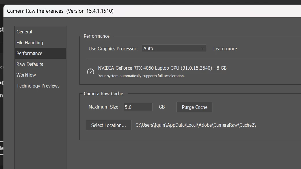 Accessing Adobe Camera Raw Preferences in Adobe Bridge won't recognize the RTX 4060 dedicated graphics card instead only shows the integrated graphics on the Intel processor. This is problematic as using any heavy processes in Adobe Camera Raw through Bridge doesn't utilize the dedicated graphics card.