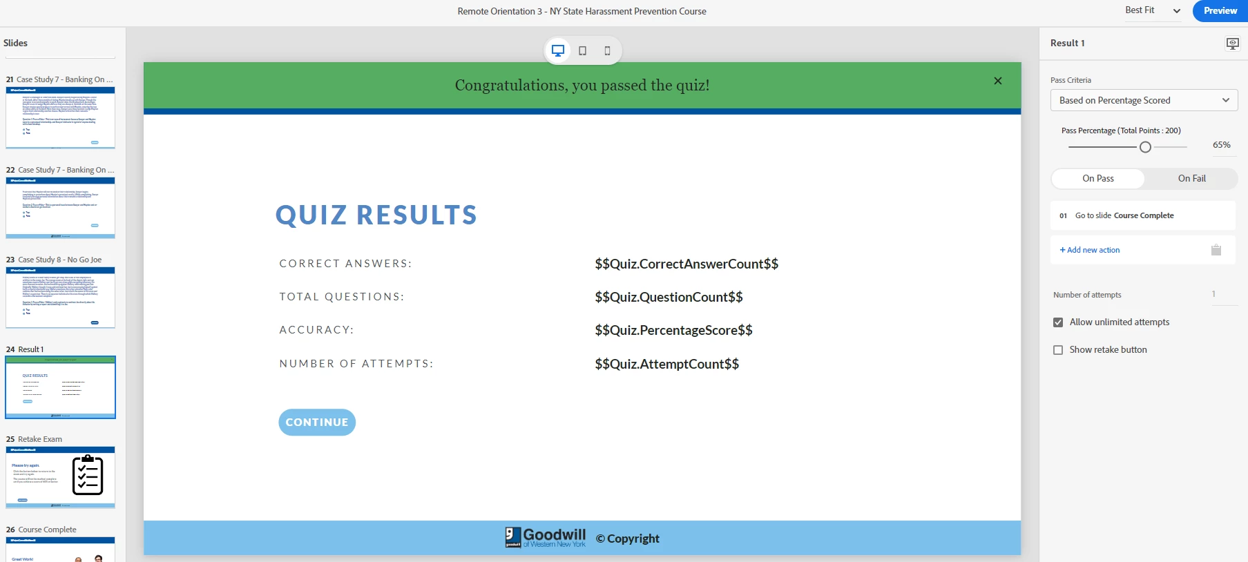 I have a graded exam, and in theory I've correctly set the pass/fail criteria (adjusted the slider to pass at 65%), and set the results slide to forward to either a "Congrats you passed" screen or a "Sorry try again" screen. The problem is, regardless of if I pass or fail it while in preview mode, hitting the continue button on the results slide always takes me to whatever the next slide in the slide order is. I can't figure out how to get it to activate based on score.