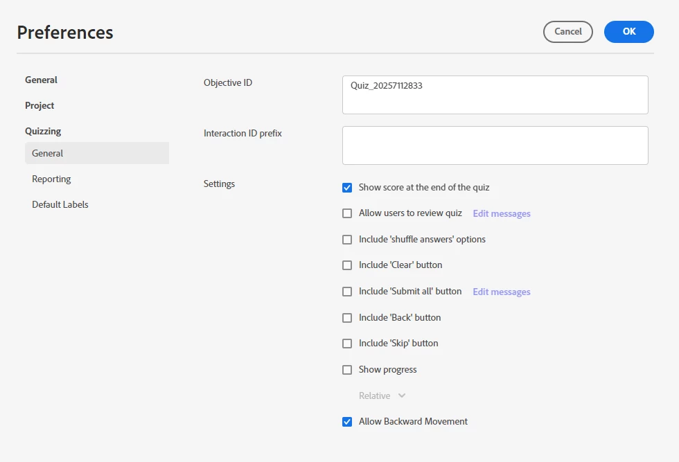 I've attached a screenshot showing the pass/fail settings and one of the quiz preferences.