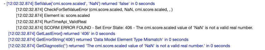 I've started noticing Captivate courses causing 406 errors because they are attempting to set cmi.score.scaled to 'NaN' which is not allowed.