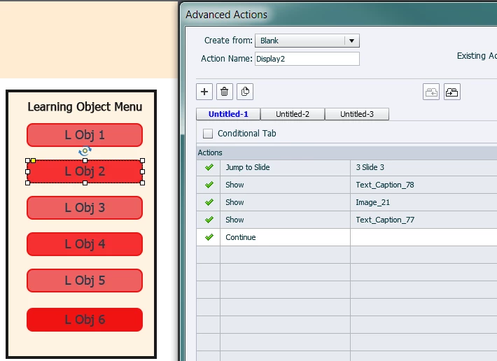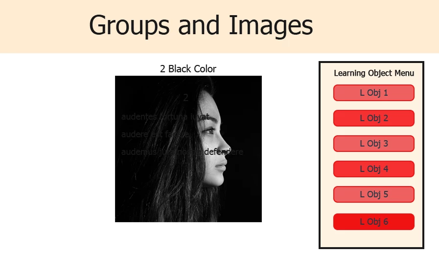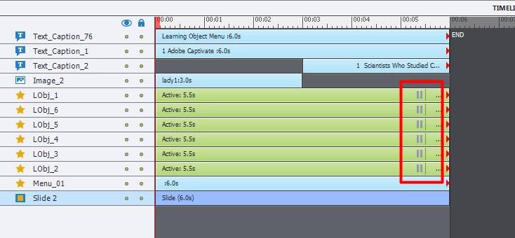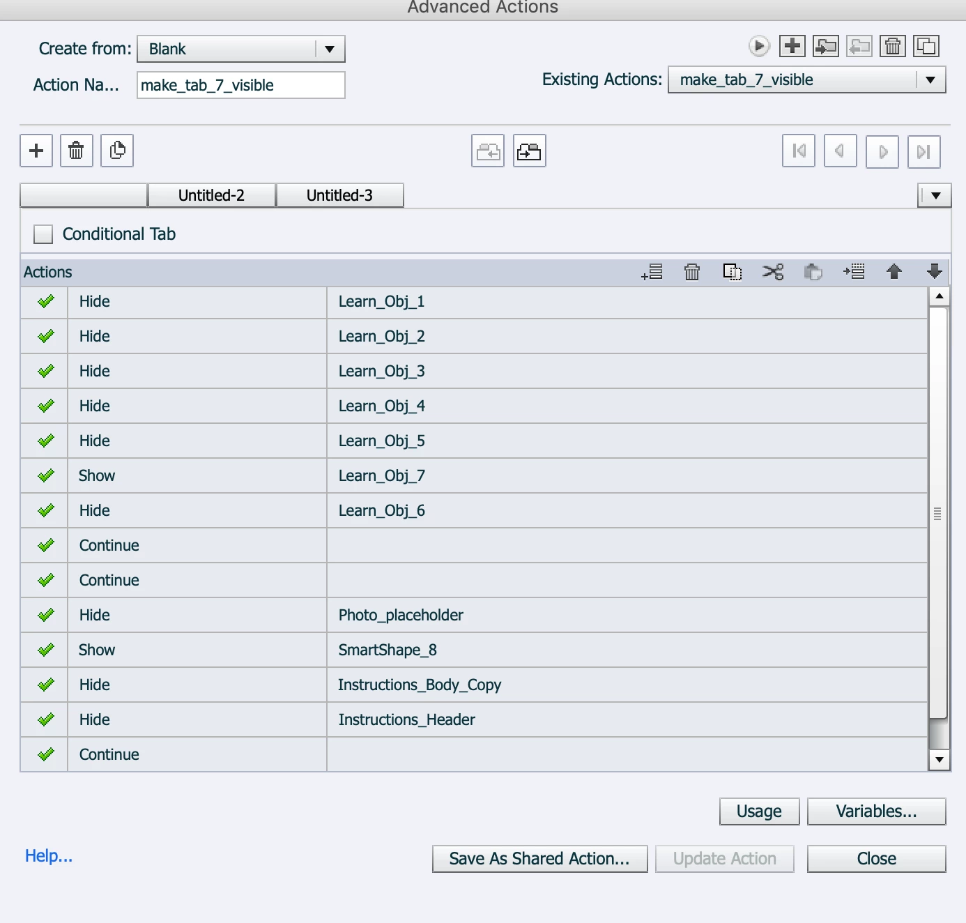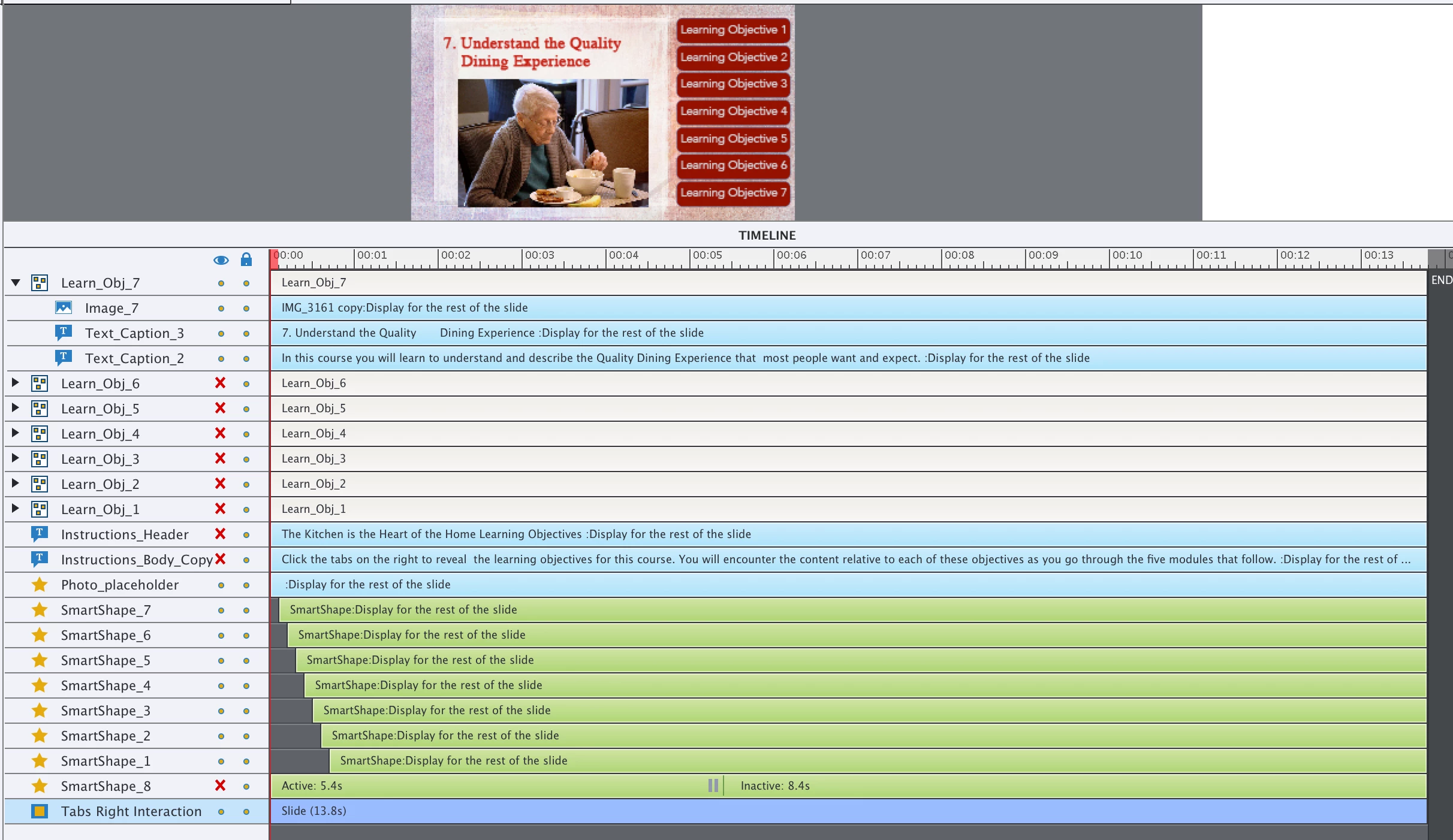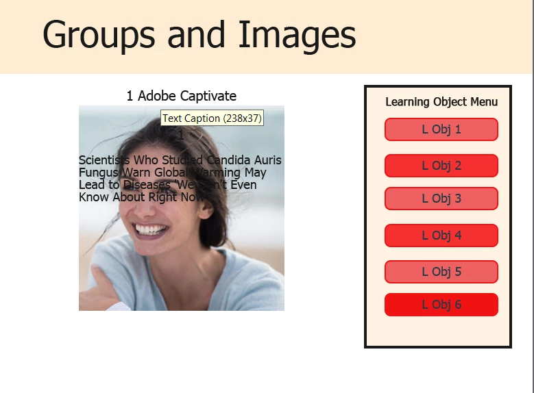 Using Captivate 2019 on a Mac. I couldn't find any answers that were less than a couple years old. Here is my problem. I have a stock Captivate learning interaction, 7 tabs to the right with advanced interaction, that shows and hides each group of text captions. I added images to the groups. In each of the 7 groups, the tab actions either show or hide, but only the first group shows both the text AND the image. I have it set up so that when you click the tab, the heading and a photo appear. The photo then fades to reveal a text block underneath it. The first group of two text captions and an image works fine. But, going down the list of tabs, the TEXT for each of the remaining 6 tabs works fine, but the IMAGES are NOT SHOWING. I tried bringing all the images to the front in the group, but that didn't work. Also, if I moved the second group to the top, that worked fine, but then the same thing happens–no images for the remaining 6 tabs, including the first group that was shuffled beneath. Do I need to stagger the start of the images in the timeline? Or, is it going to "play" just once, showing the first image all the way through, but then not jump back to "play" the subsequent images. That shouldn't matter since the action is supposed to be a tab jump to the next group.