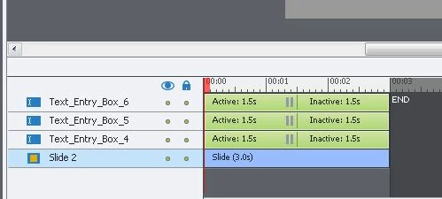 When I insert a text entry box it automatically shows up on the timeline as active for 1.5, then inactive for 1.5.
