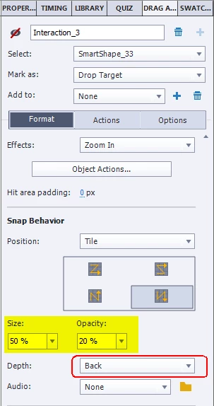 I saw the Adobe Captivate recycle bin drag and drop tutorial and it looked like the drag source objects were shrinking and hiding once dropped. This is probably easy, but I've been killing myself trying to figure this out.