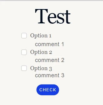 I want to simulate a test using checkbox interactive components. Basically what I need is for hidden text to show under two conditions: 1. Checkbox enabled 2. Button pressed. As a result I expect that once a student picks answers they consider correct and press a button to check, they would get a unique comment for each chosen answer. A checkbox is unique for each text and button is the same for all. Screenshot is attached as example.