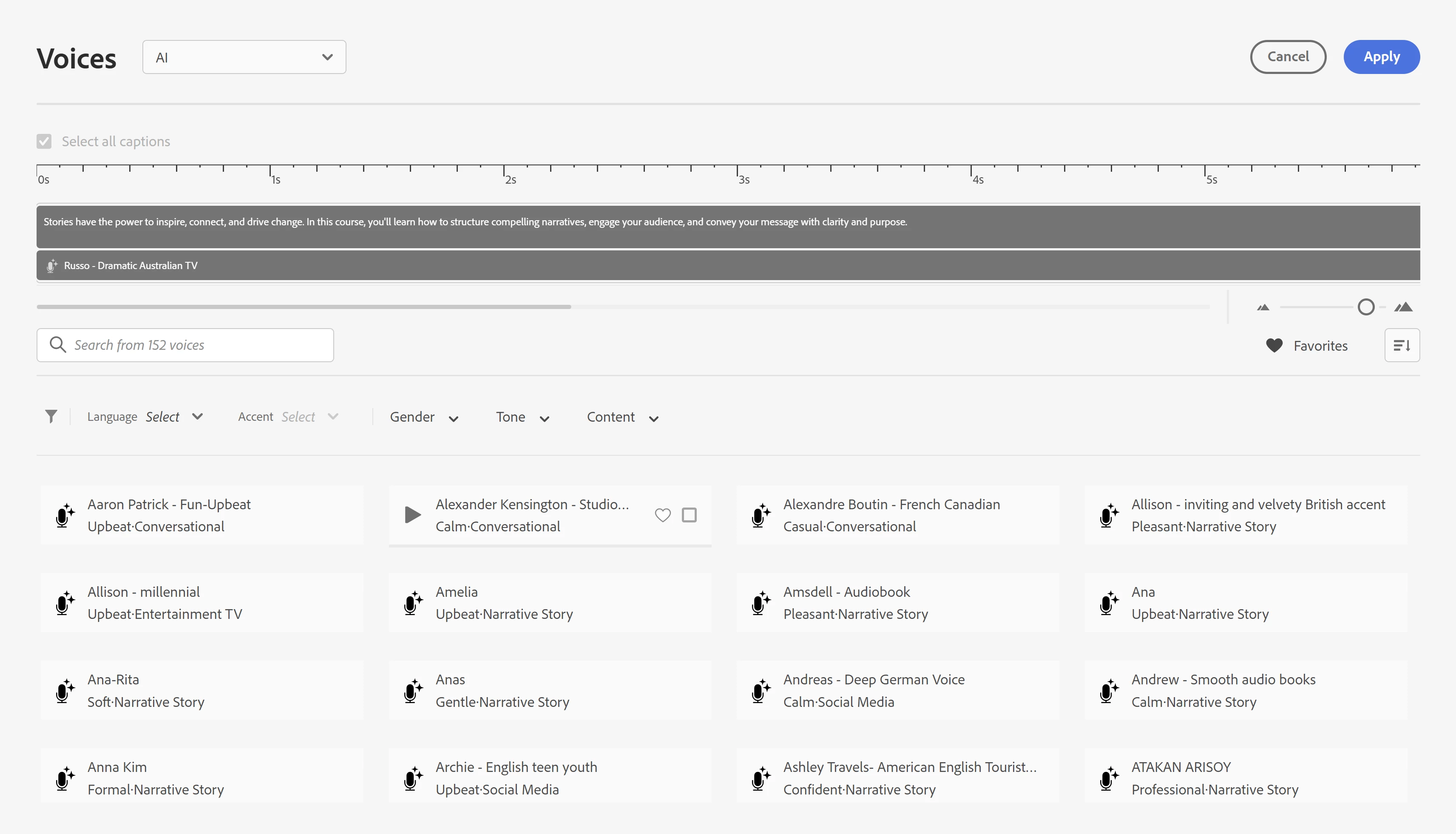Say goodbye to monotonous, robotic narration. With Adobe Captivate’s AI Voices, you can now create, engaging audio content that resonates with your audience. It’s simple. Just type your script, choose from a variety of natural-sounding voices, and let AI do the magic. Whether you need a warm conversational tone, a crisp instructional delivery, or a voice full of enthusiasm – we’ve got you covered.