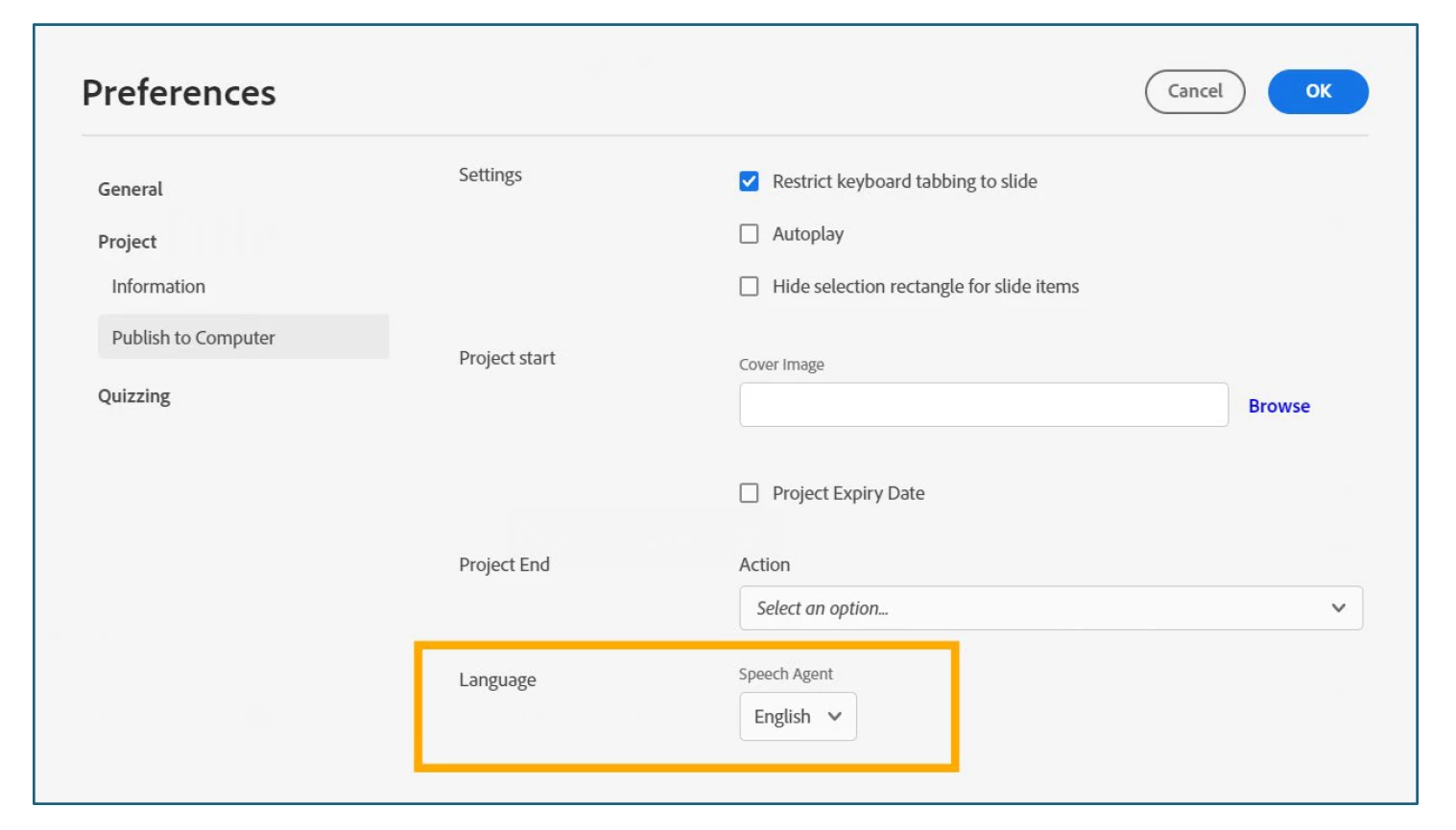 You can now configure a global speech agent language for your projects. This feature streamlines the workflow by enabling authors to set the language once, while still allowing the option to override it for specific components. Global settings will not affect pre-configured elements, ensuring that any prior customizations remain unchanged.
