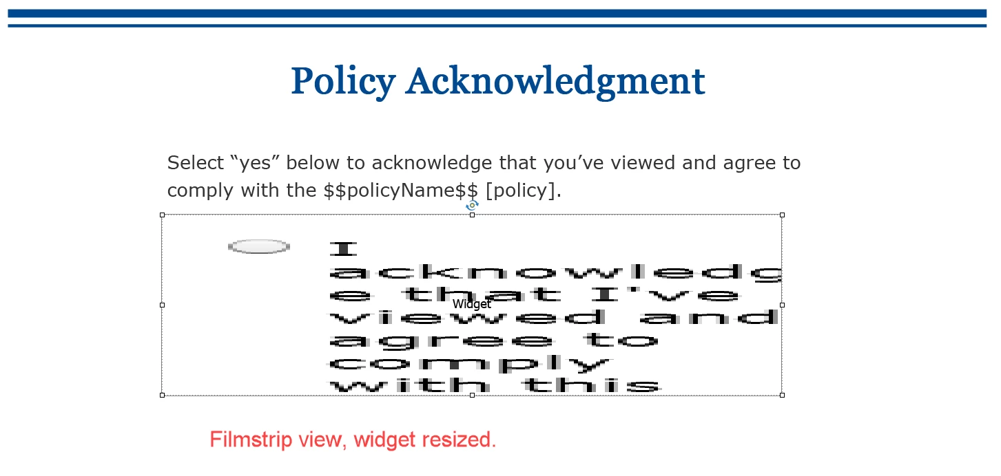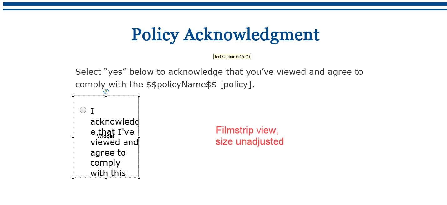 If I cut my sentence down to the bare minimum and have it be just "Yes I agree" it fits, but the second issue still stands - there are no actions associated with the widget/radio buttons. What happens when a user clicks the radio button? I just need it to take them to the next slide and also count as part of the scoring. Maybe I should just create my own custom button?