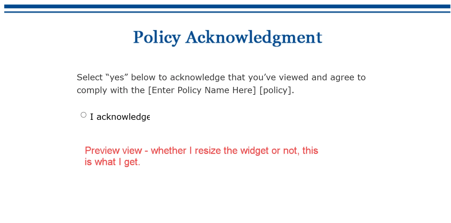 - No matter what I do to resize the widget box (whether I use the handles or adjust in the properties menu), the content gets cut off. The radio button only has one sentence, and I cannot get that to display properly both in CpC and in preview. Also, as I'm adjusting the widget size, it just becomes bigger and blurrier - but no matter how big I make it, it still cuts the sentence off from displaying.