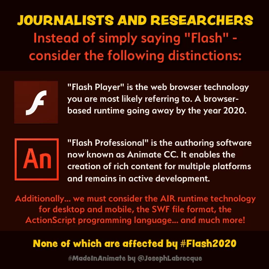 Wanted to add another comment, because there is a lot of misunderstanding about 'Flash will be or is dead', which is not correct. Flash player will be EOL, but Flash itself is very much alive, probably the most important tool for gaming and interactive animtations. The name 'Flash Builder', because of the negative 'sound' since that fruilt company condemned it, has been replaced by Animate CC. You can create Flash output and HTML5 output with Animate CC. Look at this poster: