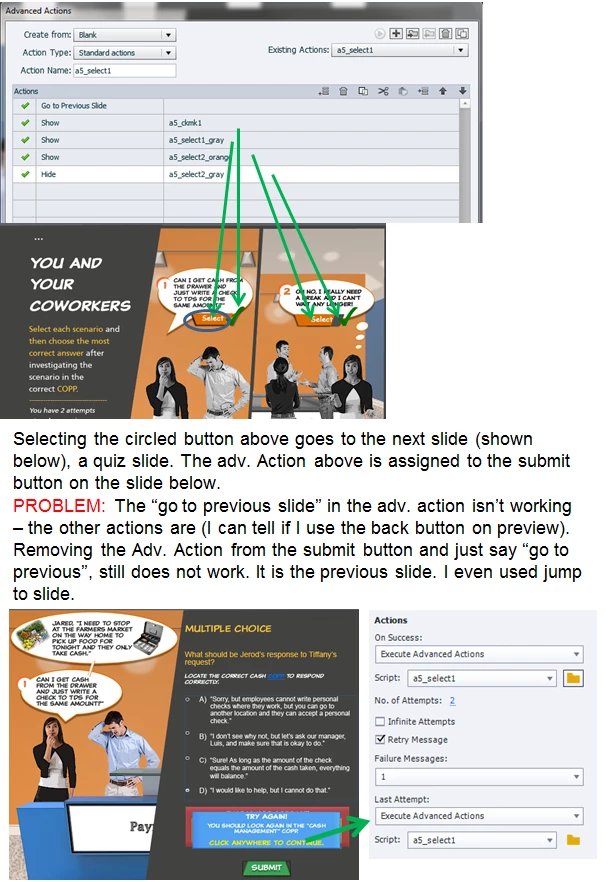 I inserted a sample of the project where I cannot get the slide to “go to previous” or return to “slide 2” using advanced actions. The other parts of the advanced actions work, just not the slide advance.