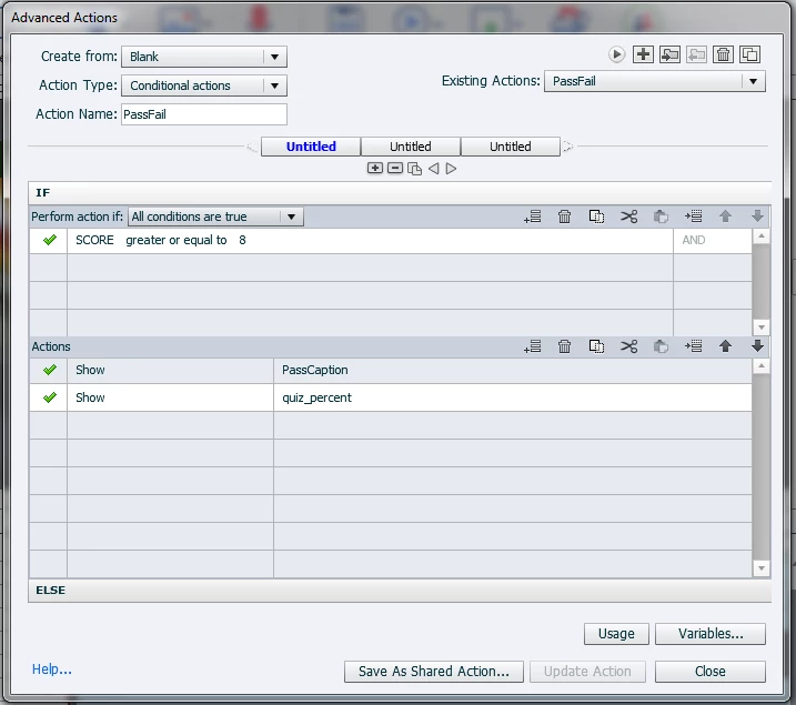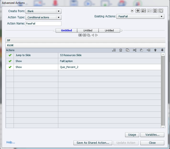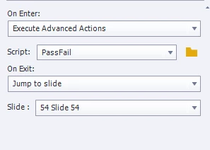If a user scores 80% or higher, I want them to go to a passing slide that shows their percent. If the user scores lower than 80%, I want them to go to a failure slide that shows the quiz percent. I have an advanced action on enter to the passing slide called "PassFail." No matter what they score, they go to a failure slide and their percentage is not visible.