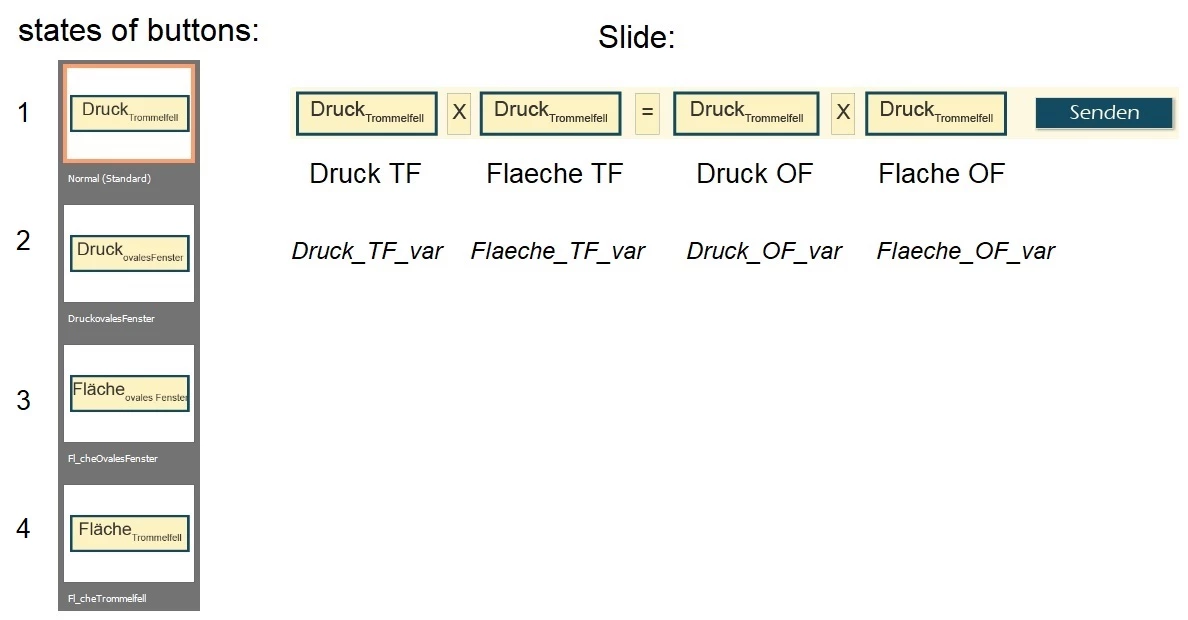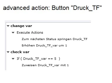 Each button has an advanced action to change state and variable, I have added the screenshot of the advanced action für button "Druck_TF".