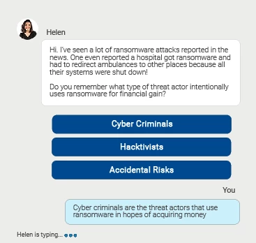 When a learner selects the correct answer, the button triggers an advanced action to show "Bruce is typing..." in the corner and then displays a response. At random times, that's getting stuck for people and not showing up. So then they get stuck and can't move forward. Other times, it shows up without any issues. And they're all testing in Chrome. We've even tried clearing cache. I tested this five times in a row without any issues at all. On the sixth test, I experienced it. Some learners are seeing this on their first run through the course.