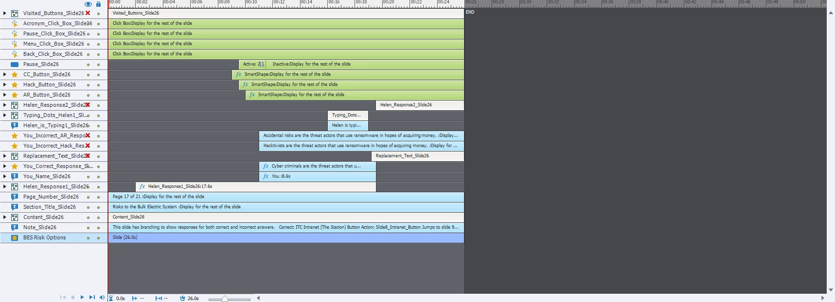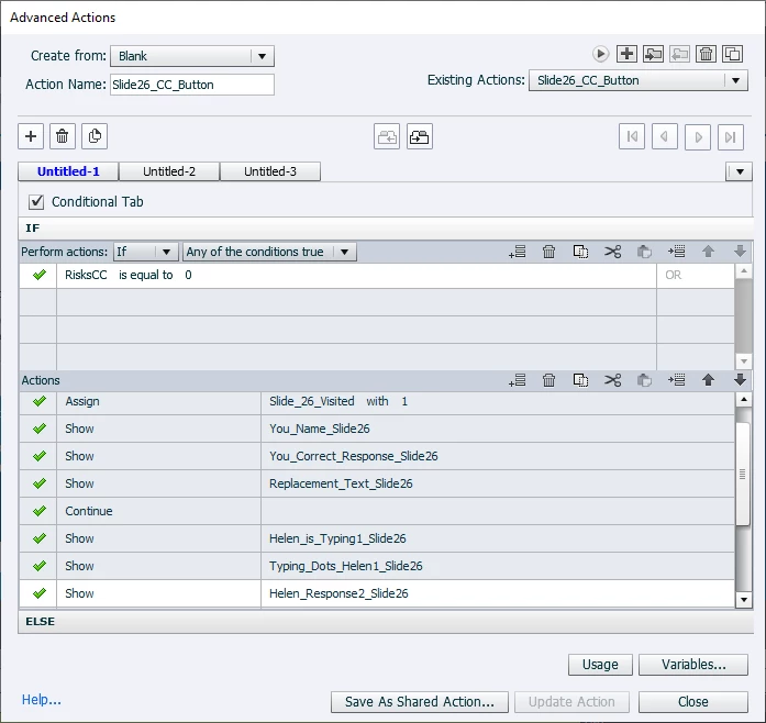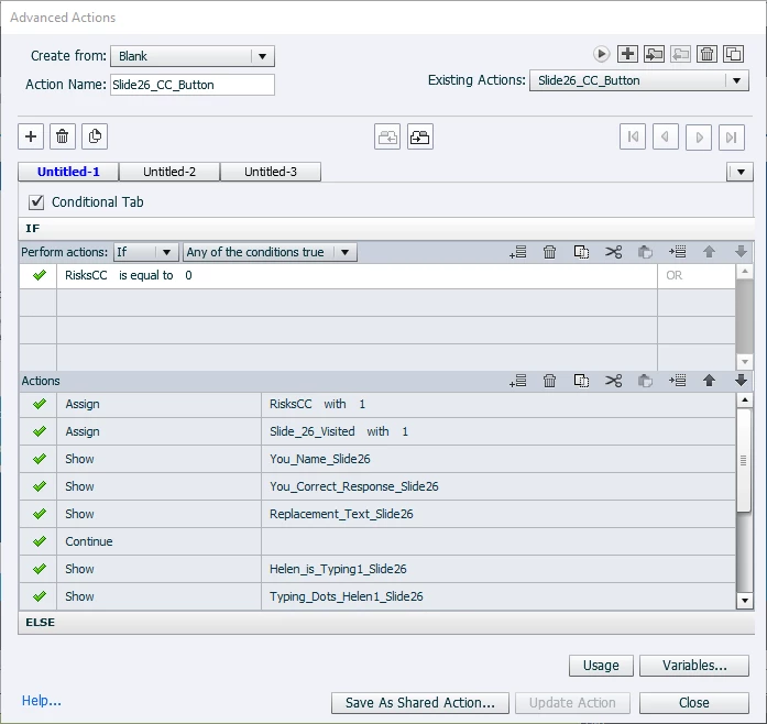 I have created scenarios in a compliance course that mimmick an IM conversation. I have elements hidden in my timeline that are triggered by an advanced action depending on the button that's clicked by the learner. However, during testing those advanced actions aren't always triggering properly and are randomly hanging up and getting learners stuck.