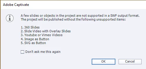 What you are showing is the dialog box which appears when you try to publish a non-responsive project to SWF. Please read the text. That dialog box never appears in responsive projects because they do not have the possibility to publish to SWF. It is also possible that you try to use a Preview method in a non-responsive project which is not valid for HTML output. Only valid Preview is F11, Preview HTML in Browser. That would be the case if you are not using the most recent version which is 11.8.1 because that version doesn't have Text Animations nor publish to SWF anymore. Moreover all the invalid Preview methods which used temporary SWF output have been taken out.