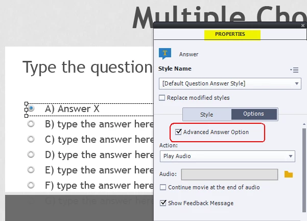 I am using Captivate 9 and the "Advanced Answer Action" does not appear on my multiple choice, single answer quiz.