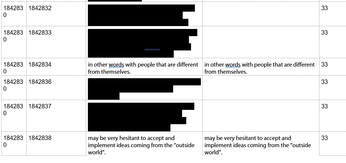 But image my surprise as I saw that the CC were broken in the Word doc. Most of them blacked out in the left column with no text in the right. In the past, every line was like the 3rd one here with the same text in both columns.