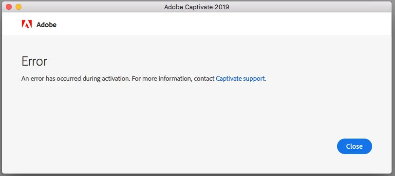 After I installed Adobe Captivate again on my Macbook, I receive an error message saying An error occurred during activation.