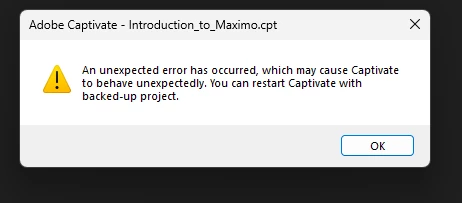 However, my course has become quite large (127 slides long, 493 Mb) and I noticed that for some reason the icon in the header is no longer visible... it is there, but it is acting like the color has changed on the icon. When I go to select icon to change the color, the program crashes and says "An unexpected error has occured, which may cause Captivate to behave unexpectedly. You can restart Caaptivate with Backed-up project." However, even starting it up with a backed up project, this error still occurs. It lets me change the text and solid fill, but any time I touched 'icon' it crashes.