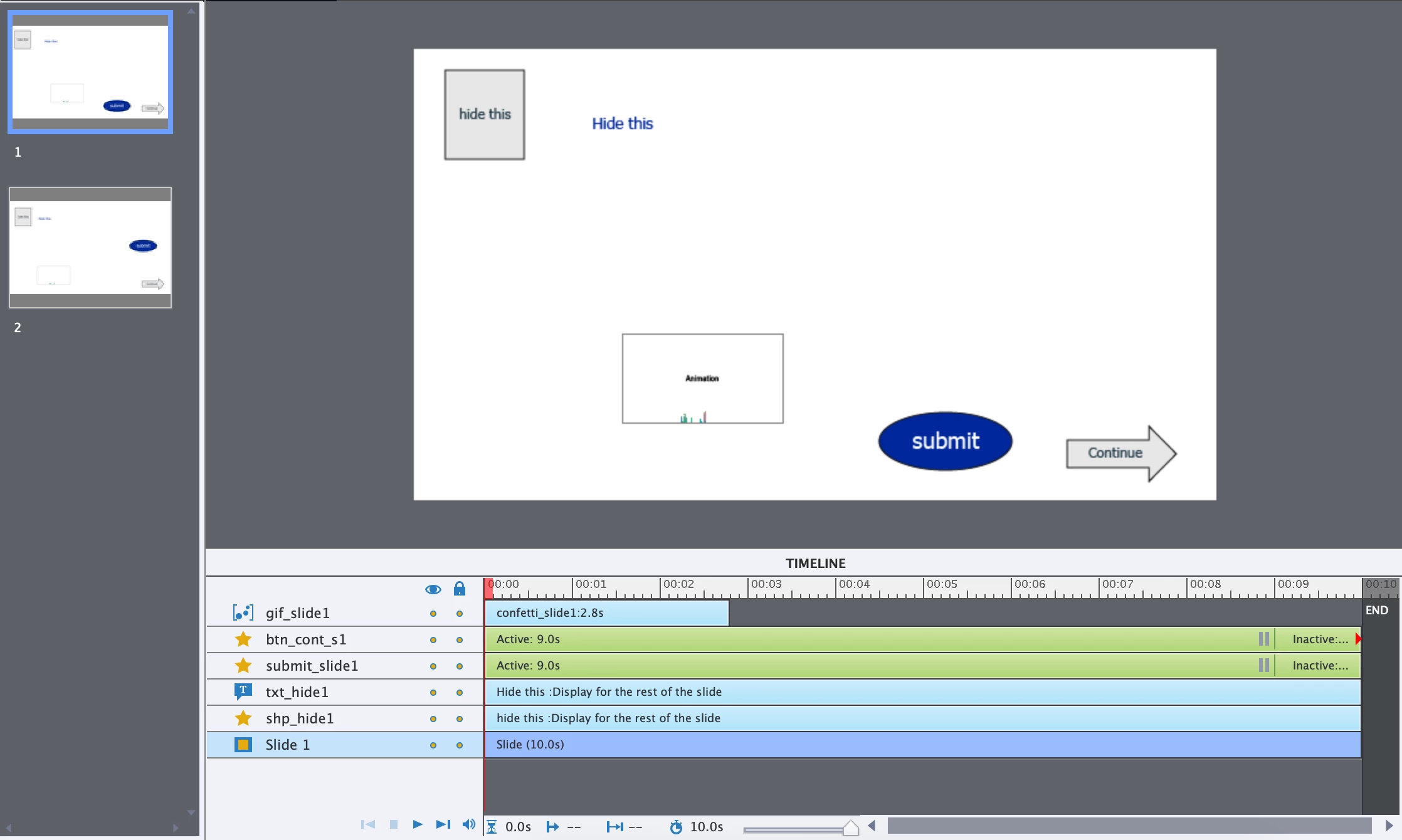 I have a colleague who is trying to add a .gif to several slides in a Captivate project. The idea is that when someone clicks a button a little .gif showing confetti plays. The advanced action she is using is very simple: on success of the button click, a shape disappears, a bit of text disappears and the confetti .gif plays. It works beautifully on the first slide, but then the .gif won't play on success of the button click on the second slide. We've tried everything we can think of (and were able to get it to work in a different program) so we're wondering if this is a glitch or if there is some reason Captivate won't let this happen or, of course, if we're missing something.