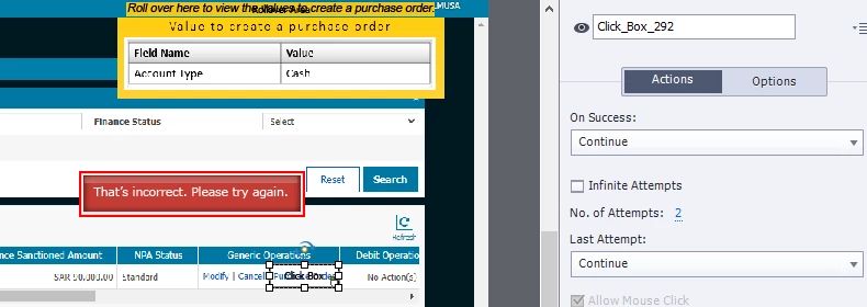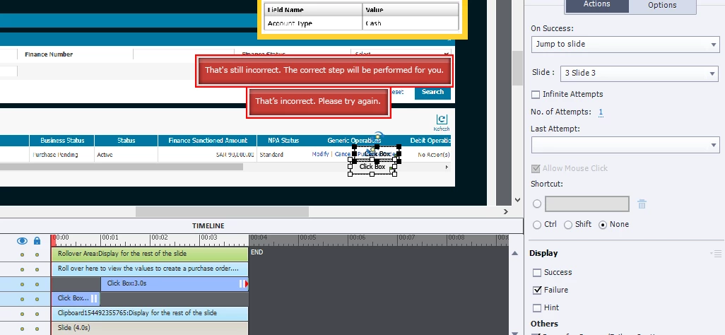 2nd failure message. Its still incorrect, let me perform this for you. (This is first sceanrio where No of Attempts are 2 with 1 click box, I want both failure message different) is it possible to get two different messages for 1 Click Box?