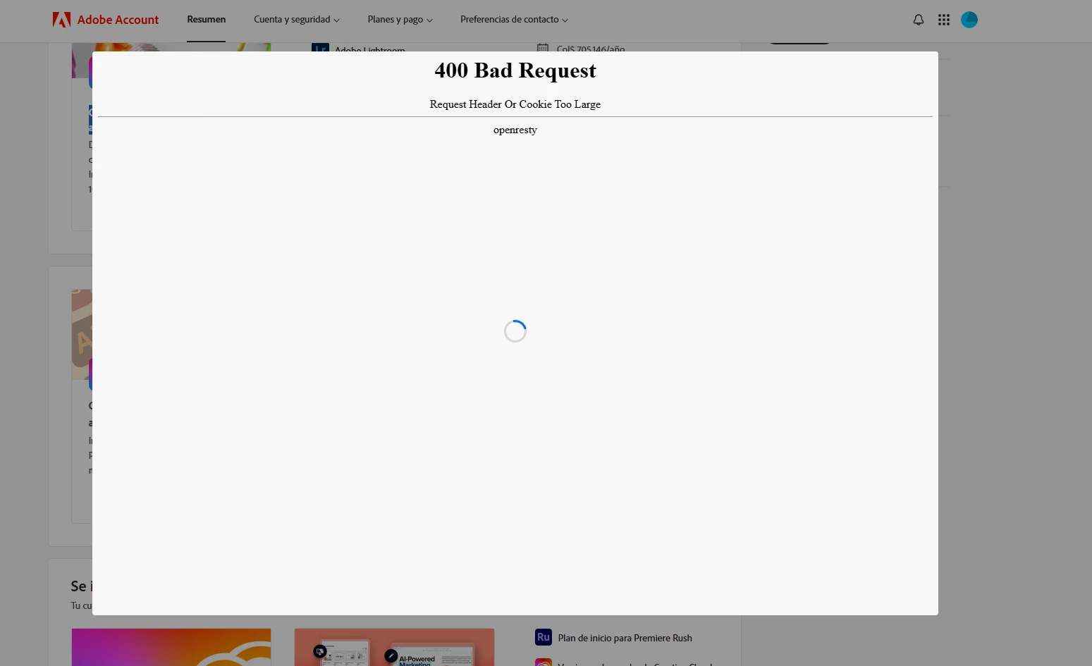 ¡AYUDA! Error al cambiar a plan estudiantil en Adobe: "400 Bad Request" y sin acceso a soporte