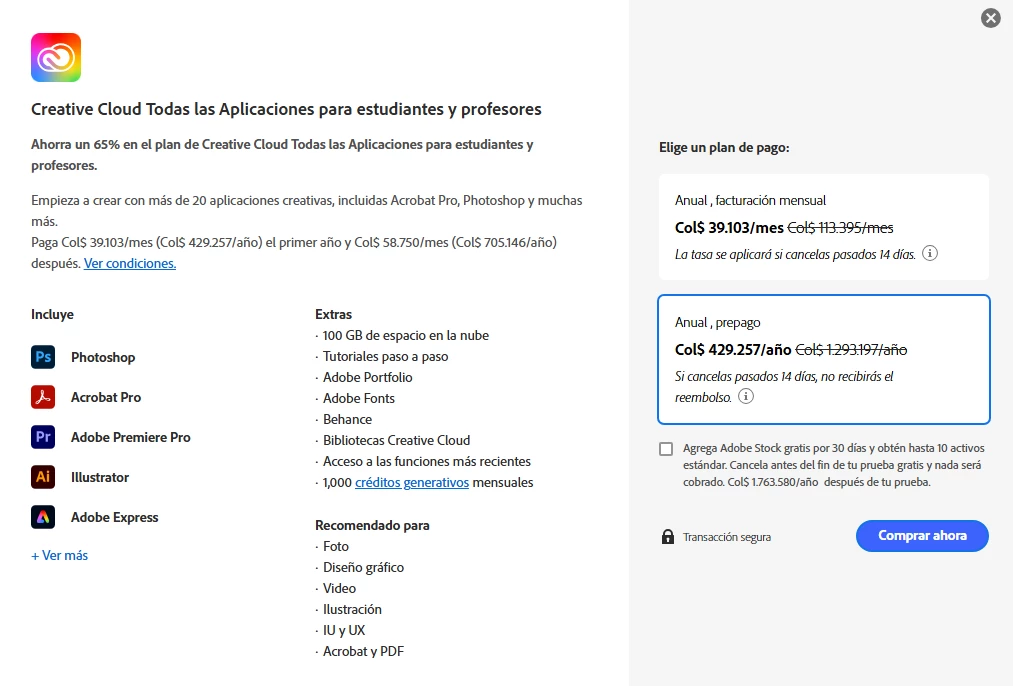 new "Creative Cloud All Apps 100GB" plan. The annual fee is $429.257 Colombian pesos and is