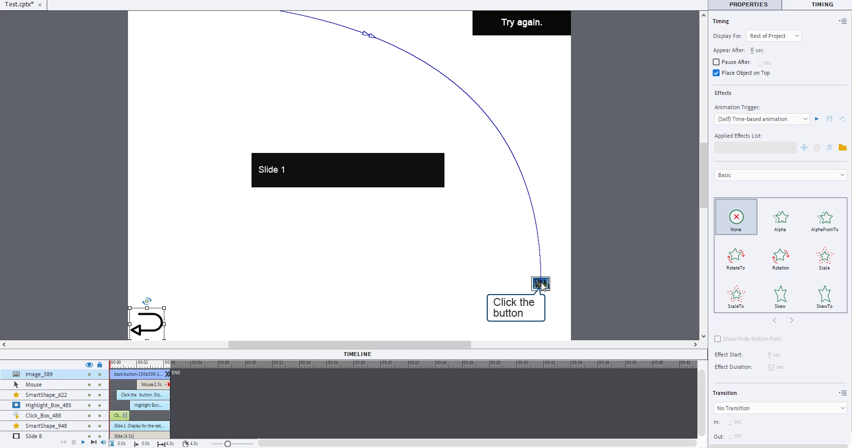 Im working on a project where I would need to add a back button to go back to the previous slide, I wanted it to be hiding and goes on when roll over and stays for the rest of the project.